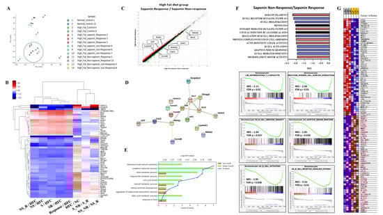 Transcriptomic analysis reveals molecular signatures differentiating saponin responders from non-responders in the High-Fat diet (HFD) group. (A) Principal component analysis (PCA) of RNA-seq data across normal control, HF control, saponin response, non-response, non-saponin response, and non-response groups. (B) Heatmap showing sample-to-sample correlations among the groups based on transcriptomic profiles. (C) Gene expression scatter plot comparing saponin response and saponin non-response groups; differentially expressed genes with fold change ≥ 1.5 and p-value ≤ 0.05 are highlighted. (D) STRING analysis of RNA-seq data comparing saponin response and saponin non-response mice, visualizing high-confidence protein–protein interactions (confidence score 0.7–1.0). (E) Gene ontology (GO) enrichment analysis comparing HFD and HFD + saponin groups, highlighting downregulation of pathways related to oxidation–reduction and lipid metabolism. (F) Gene set enrichment analysis (GSEA) identifying the top 20 enriched pathways in the saponin response group; a representative GSEA enrichment plot is shown below. (G) Heatmap showing key genes significantly enriched in the saponin response group compared to the non-response group, as derived from GSEA results.