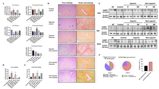 In the pre-biopsy liver tissues of the HFD group, mRNA analysis revealed a significant increase in HAMP1 expression, with a 1.538-fold rise in the High-Fat saponin response group compared to controls, while it decreased to 0.673-fold in the saponin non-response group. In the High-Fat non-saponin category, responders showed a 1.467-fold increase, but non-responders decreased to 0.314-fold. At the endpoint biopsy, HAMP1 expression trended downward in both response groups. In the Western diet model, liver tissues were similarly analyzed. Pre-biopsy results showed a significant decrease in HAMP1 expression in both saponin response (p = 0.0011) and non-saponin response groups (p = 0.0203). At the endpoint biopsy, HAMP1 significantly increased in the saponin response group (p = 0.0021) compared with controls. The MCD diet model also showed a significant reduction in HAMP1 expression in the MCD control (p < 0.0001) and a decrease in the MCD saponin group (p = 0.0479), suggesting different regulatory pathways for HAMP1 based on MASLD induction (Figure 5A).