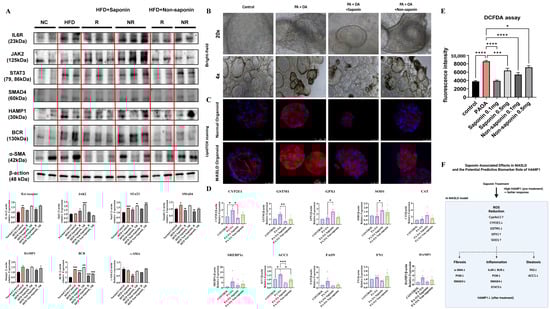 Overall, our data support a model in which red ginseng saponins alleviate MASLD by dampening IL6–JAK–STAT3-mediated inflammation, which in turn reduces fibrosis, lipogenesis, and oxidative stress. The cross-validation of HAMP1 downregulation in both murine and organoid systems suggests its potential as a biomarker linking inflammation and redox homeostasis. These multi-level effects highlight the therapeutic potential of saponins, although further mechanistic studies are warranted.