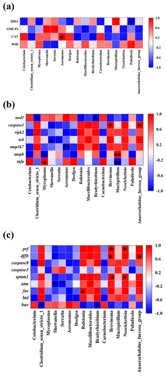 3.5. Correlation Analysis Between Intestinal Microbes and Liver Antioxidant, Immune, and Apoptosis Indexes
