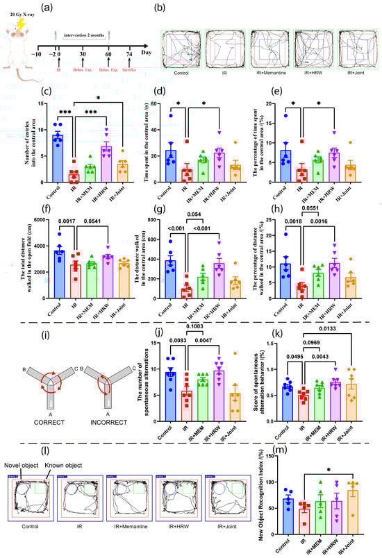 In the novel object recognition test, the control group and all intervention groups exhibited higher novel object recognition indices compared to the IR group. However, only the IR + Joint group demonstrated a statistically significant improvement in the novel object recognition index relative to the IR group (p < 0.05), as shown in Figure 1l,h.