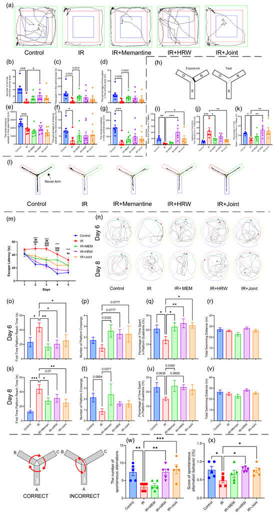 Figure 2. Behavioral tests on days 60–73 post-irradiation. (ag) Open field test on day 60 post-irradiation (n = 8 per group): (a) trajectories of rats in the open field on day 60 post-irradiation for each group; (b) number of entries into the central area; (c) time spent in the central area (seconds); (d) percentage of time spent in the central area (%); (e) total distance walked in the open field (cm); (f) percentage of distance walked in the central area (%); (g) distance walked in the central area (cm). (hi) Y-maze novel arm exploration test on day 61 (n = 5): (h) schematic of the Y-maze novel arm exploration test; (i) number of entries into the novel arm; (j) latency to first entry into the novel arm in the Y-maze (seconds); (k) percentage of time spent in the novel arm in the Y-maze (%); (l) trajectories of novel arm exploration in the Y-maze(The green arm represents the Novel Arm, the blue arm represents the Start Arm, and the red arm represents the Other Arm (Familiar Arm)). (mv) Water maze test, n = 7 per group: (m) escape latency trend in the water maze (*: Control group vs. IR group; #: Memantine group vs. IR group; &: HRW group vs. IR group; @: Combined treatment group vs. IR group; *** p < 0.001, Control group vs. IR group; ## p < 0.01, Memantine group vs. IR group; && p < 0.01, HRW group vs. IR group; &&& p < 0.001, HRW group vs. IR group; @ p < 0.05, Joint group vs. IR group; @@ p < 0.01, Joint group vs. IR group); (nv) spatial exploration in the water maze; (n) trajectories of spatial exploration in the water maze; (o) first-time platform reach time in the water maze on day 6; (p) number of platform crossings on day 6; (q) percentage of time spent in platform quadrants on day 6; (r) total swimming distance on day 6; (s) first-time platform reach time on day 8; (t) number of platform crossings on day 8; (u) percentage of time spent in platform quadrants on day 8; (v) total swimming distance on day 8. (w,x) Y-maze spontaneous alternation test at day 73 post-irradiation: (w) number of spontaneous alternations; (x) score of spontaneous alternation behavior (%). (* p < 0.05, ** p < 0.01, *** p < 0.001, compared with the IR group).