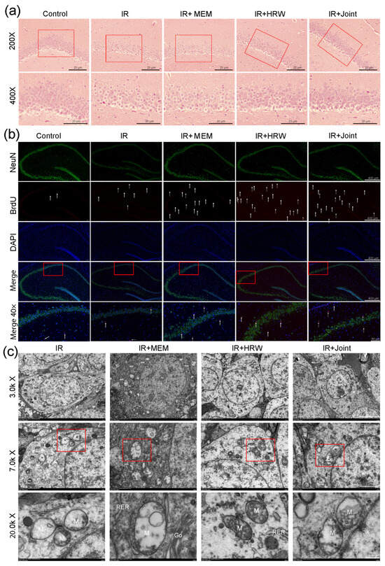 BrdU + NeuN immunofluorescence double labeling was used to assess neuronal maturity and neurogenesis. NeuN, which labels mature neurons, revealed sparse, loose, and disorganized neurons in the IR group, whereas the control group exhibited dense and orderly neuronal organization. All treatment groups demonstrated varying degrees of improvement in neuronal arrangement compared to the IR group. BrdU, which marks newly generated neurons, showed minimal compensatory neurogenesis in the control group, likely due to functional integrity and a higher proportion of mature neurons. Among the irradiated groups, the number of newly generated neurons ranked from highest to lowest as follows: IR + Joint > IR + memantine > IR + HRW > IR (Figure 3b).