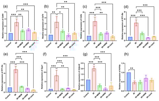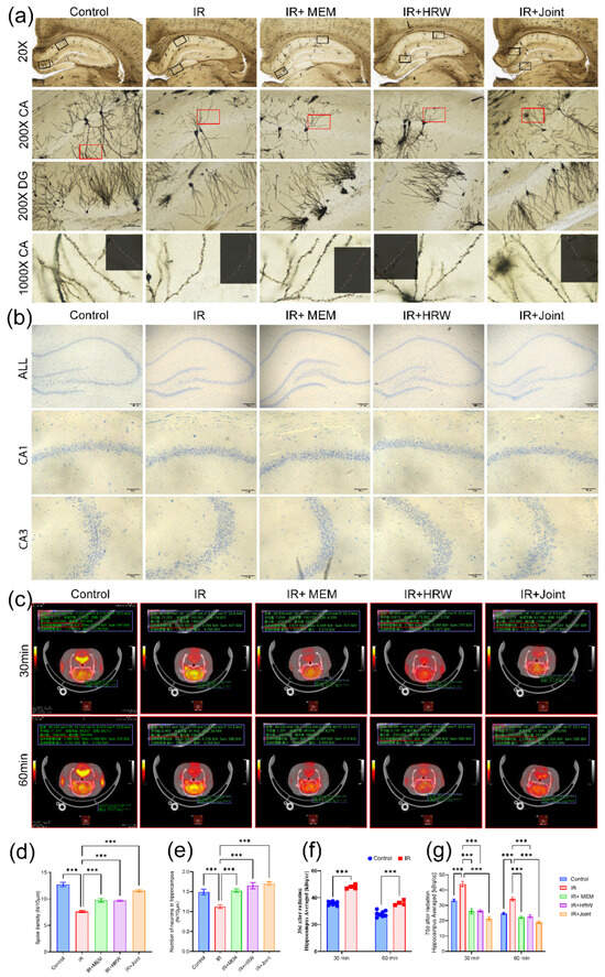 The results of Nissl staining revealed a significant reduction in neuronal numbers in the IR group, with neurons exhibiting a loose arrangement. In contrast, the intervention groups (IR + memantine, IR + HRW, and IR + Joint) showed marked improvements, as shown in Figure 4b. Quantitative analysis of neurons in the CA1 region demonstrated that the control group, IR + memantine group, IR + HRW group, and IR + joint group had significantly higher neuronal counts per unit length compared to the IR group, with statistically significant differences (p < 0.001). Notably, the IR + Joint group showed the most significant improvement, as shown in Figure 4e.