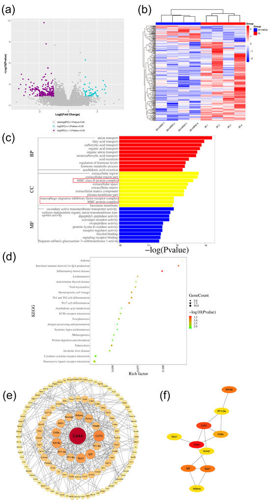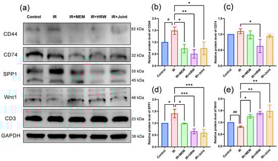 RT-qPCR and Western blotting were used to validate key genes and proteins identified in the transcriptomic analysis, showing results consistent with the transcriptomic data. After ionizing radiation, hippocampal tissues exhibited elevated expression levels of CD44, CD74, CD3e, RT1-Ba, RT1-Da, SPP1, and AdipoQ, while HRW intervention significantly reduced these levels compared to the IR group.