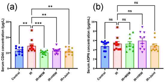 In our experiments, serum CD44 levels were lower in the Control group and all intervention groups compared to the IR group. This aligns with a report in Nature Medicine suggesting that CD44 could serve as a cerebrospinal fluid (CSF) biomarker for Alzheimer’s disease (AD) [55]. However, the conditions for defining biomarkers are relatively stringent. Whether CD44 can serve as a biomarker for chronic radiation-induced brain injury (chronic RIBI) remains to be further investigated.