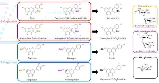 To address this, we assessed the enzymatic activity of α-l-rhamnosidase toward eight flavonoid glycosides bearing either rutinose [α-l-rhamnopyranosyl-(1→6)-β-d-glucopyranose] or neohesperidose [α-l-rhamnopyranosyl-(1→2)-β-d-glucopyranose]. α-l-Rhamnosidase catalyzed the hydrolysis of the terminal rhamnose moiety in all tested flavonoids, producing the corresponding mono-O-glucoside derivatives (Figure 1).