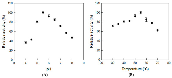 Effects of (A) pH and (B) temperature on α-l-rhamnosidase activity for D. lotus leaf extract. Data represent the means of three experiments, and error bars represent the standard deviation.