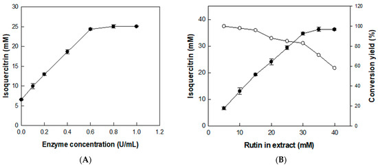 Effects of (A) enzyme and (B) substrate concentrations on the production of isoquercitrin from rutin in D. lotus leaf extract. Data represent the means of three experiments and error bars represent the standard deviation.