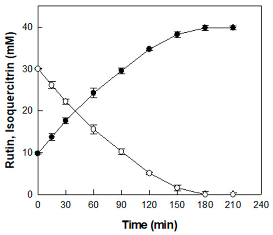 Time-course reaction for the production of isoquercitrin (●) from rutin (○) in D. lotus leaf extract. Data represent the means of three experiments, and error bars represent the standard deviation.