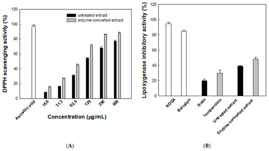 (A) Antioxidant activities evaluated using the lipoxygenase 2,2-diphenyl-1-picrylhydrazyl (DPPH) radical scavenging assay. Black and gray bars represent the untreated and enzyme-converted extracts, respectively. (B) Anti-inflammatory activities evaluated using the lipoxygenase inhibitory activity assay. Data represent the means of three experiments, and error bars represent the standard deviation. Statistically significant differences among groups were determined by one-way ANOVA followed by Tukey’s post hoc test (p < 0.05).