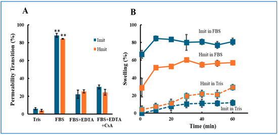 Induction of MPT in Imit and Hmit by extracellular media: (A) Percentage of mitochondria undergoing MPT after exposure to either FBS or Tris-sucrose buffer. (B) Time-dependent increase in the percentage of swollen mitochondria following the addition of FBS. The horizontal axis represents time after FBS exposure, with the first measurement at 1 min. For both panels, n = 3 independent experiments; in each experiment, 50 mitochondria were analyzed: (A) **, p < 0.01 vs. Tris. (B) Imit showed a significantly higher percentage of swelling than Hmit at all time points in FBS (p < 0.05).