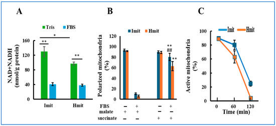 Loss of mitochondrial activity following exposure to extracellular medium: (A) Total NAD and NADH content in mitochondria incubated in either FBS or Tris-sucrose buffer. n = 5. *, p < 0.05; **, p < 0.01. (B) Percentage of mitochondria exhibiting membrane polarization in response to malate or succinate, measured before and after 60 min of incubation in FBS. n = 3 experiments; 50 mitochondria were analyzed per experiment. **, p < 0.01 vs. FBS(+) and malate(+); ##, p < 0.01 vs. Hmit under the same condition. (C) Time-dependent decrease in the percentage of mitochondria that could be polarized with succinate after incubation in FBS. The horizontal axis represents the incubation time in FBS.