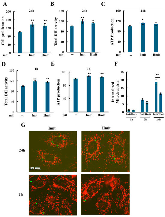 Both Imit and Hmit significantly promoted cell proliferation after 24 h (Figure 3A), as confirmed by increased DH activity (Figure 3B) and elevated intracellular ATP levels at 24 h (Figure 3C). Notably, DH activity (Figure 3D) and ATP levels (Figure 3E) also rose within 1 h of administration, suggesting an immediate enhancement of cellular bioenergetics rather than increased cell number. No significant differences were observed between Imit and Hmit in terms of cell proliferation effects and these early effects.