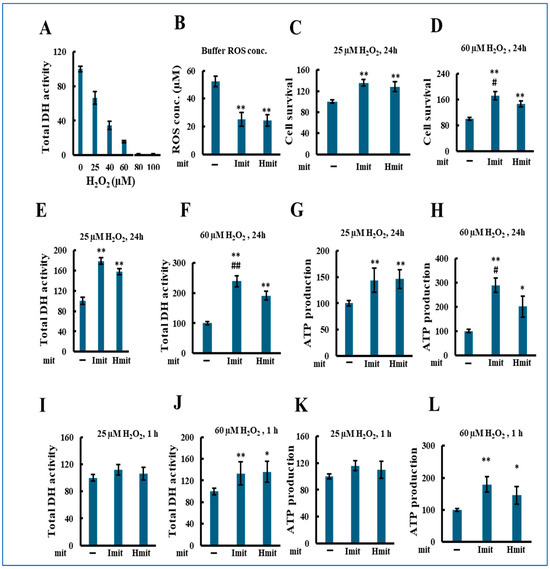 We next evaluated the effects of mitochondrial administration under oxidative stress by co-treating H9c2 cells with mitochondria and hydrogen peroxide (H2O2). As shown in Figure 4A, H2O2 alone reduced total DH activity in a concentration-dependent manner after 24 h. Both Imit and Hmit decreased extracellular H2O2 levels from 55 to 25 μM, with no significant difference between them (Figure 4B). Based on cytotoxicity results, we chose 25 μM (mild stress) and 60 μM (severe stress) for further experiments.