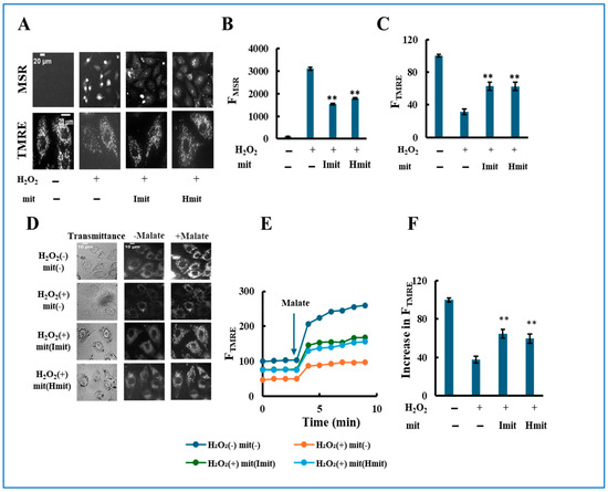 Protective effects of mitochondrial co-treatment under strong oxidative stress: single-cell analysis. H9c2 cells were simultaneously treated with 60 μM H2O2 and mitochondria, followed by 24 h incubation: (A–C) Evaluation of ROS generation and mitochondrial polarization at the single-cell level. (A) Representative fluorescence images showing MitoSOX Red (MSR, top) and TMRE (bottom) signals. Scale bar: 20 μm. (B,C) Quantification of MSR (B) and TMRE (C) fluorescence intensities. FMSR and FTMRE represent the integrated fluorescence intensity of MitoSOX Red and TMRE per cell, respectively. n = 3 independent experiments; >15 cells were analyzed per experiment. **, p < 0.01 vs. H2O2 only. (D–F) Assessment of electron transport chain (ETC) activity by TMRE fluorescence in digitonin-permeabilized cells. (D) Representative TMRE fluorescence images acquired before and after the addition of malate. (E) Time-dependent changes in FTMRE, reflecting mitochondrial proton-pumping activity. FTMRE was presented as the average behavior of 15 cells measured simultaneously in a single experiment. The arrow indicates the time point of malate addition. Fluorescence intensities were normalized to 100 in untreated cells prior to malate addition. (F) Quantification of the increase in FTMRE after malate addition. The increase in untreated cells was normalized to 100. n = 3 independent experiments; 15 cells were analyzed per experiment. **, p < 0.01 vs. H2O2 without mitochondria.