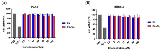 The cytotoxicity of FA and FA-Glu on PC12 cells (A) and bEnd.3 cells (B) (mean ± SD, n = 3; the same experiment was repeated thrice, * p < 0.05, ** p < 0.01 versus FA). bEnd.3 and PC12 cells without any treatment were used as control groups (cell viability 100%), respectively.