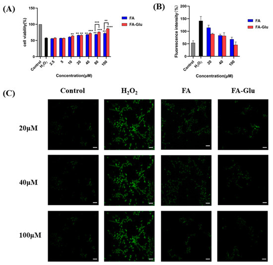 The PC12 cell in the logarithmic growth stage possesses typical neuronal morphology and function [32]. It is a reliable neuronal cell model. To examine FA-Glu’s protection effects against oxidative damage in neuronal cells, the PC12 cell was incubated with FA and FA-Glu at concentrations of 2.5, 5, 10, 20, 40, 80, and 100 μM, respectively. H2O2 was added to induce oxidative cell damage, followed by the MTT assay to assess cell survival rates. Cell viability is shown in Figure 4A. Compared to the control (treated with PBS, with 100% cell viability), PC12 cells that were not co-incubated with FA or FA-Glu underwent significant oxidative damage via H2O2, with cell viability decreasing to 57.8% (positive control). This established the H2O2-induced nerve injury model. For cells co-incubated with FA or FA-Glu at low concentrations (2.5 and 5 μM), the cell damage was similar to that of the positive control, with no antioxidative protection found from the agents. Starting at 10 μM, FA-Glu exhibited reduced cell oxidative damage effects compared with the positive control (p < 0.01). At concentrations of 20 and 40 μM, both agents significantly attenuated oxidative cell damage. When the concentration was 80 μM, cells co-incubated with FA-Glu survived (p < 0.001) with 76.3% cell viability, which was higher than cells co-incubated with FA (p < 0.001). The most significant antioxidant effects of FA-Glu were identified at a concentration of 100 μM (p < 0.0001) with 86.6% cell viability, higher than FA (p < 0.01). At all test concentrations using FA, cell viabilities were below 80%. The results demonstrate that FA-Glu is superior to FA, effectively suppressing H2O2-induced oxidative injury in PC12 cells with increasing concentrations, thus benefiting neuronal protection.