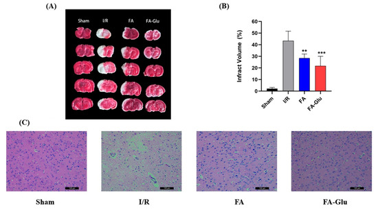 The neuroprotective effects of FA and FA-Glu were further evaluated, in vivo, using a rat model of middle cerebral artery occlusion (MCAO). The TTC staining of brain sections are shown in Figure 5A,B. Red denotes normal brain sections, while white indicates infarcted brain areas. The percentage of cerebral ischemia in the sham group was 2.2%, showing that the MCAO model was well-established. The infarcted area percentage reached 43.42% in the ischemia–reperfusion (I/R) group, indicating the successful establishment of the I/R model. The percentage was 28.49% for the FA group. This downward trend is reflected by the 21.79% of the FA-Glu group. Both FA (p < 0.01) and FA-Glu (p < 0.001) significantly reduced the infarcted brain areas compared to the I/R group, with FA-Glu showing greater neuroprotective activity than FA. These findings were consistent with that of PC12 cell oxidative damage experiments.