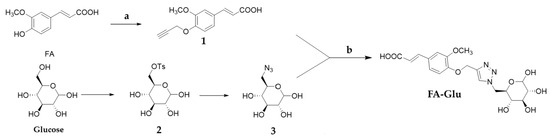 The glycosylation design and synthesis of FA-Glu is important for achieving improved water solubility, stability, bioavailability, antioxidant activities, and stronger neuroprotection compared to FA. One such design is 4-O-β-D-glucopyranosyl FA. However, FA-Glu is specifically designed to conjugate glucose at the C6 position to FA at the 4-hydroxy position using 1,2,3-triazole as a linking bridge. The ability of the agent to cross the blood–brain barrier (BBB) remains a crucial factor and primary challenge in the development of central nervous system drugs [22]. A carrier-mediated transporter (CMT) system seems to be a promising method to facilitate the agent’s ability to cross the BBB. Glucose transporter 1 (GLUT1) is expressed in the endothelial cells, red blood cells, and astrocytes of the BBB, and is responsible for transmembrane glucose transport and providing the main energy source for brain tissue [23]. Based on the high affinity of glucose to GLUT1, the glucose–FA conjugate should penetrate the BBB easily. When glucose is conjugated with ibuprofen at the C6 position, its affinity with GLUT1 has minimal impairment [24]. This example supports the fact that the C6-OH linking position of glucose is appropriate for the GLUT1 target. Since 1,2,3-triazole is an ester group bioisostere in medicinal chemistry [25], it was used as the linker between FA and glucose to protect the FA phenolic hydroxyl group for better stability and bioactivity of the molecular structure. Additionally, 1,2,3-triazole can be constructed via the well-known “click” chemistry reaction under mild conditions. Therefore, the target derivative FA-Glu was designed and successfully synthesized.