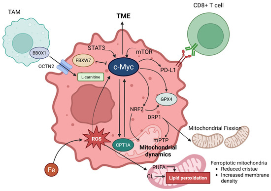 Comprehensive figures for interconnection between carnitine shuttle (CPT1A) and ferroptosis via c-Myc. L-carnitine enters cancer cells via OCTN2, facilitated by BBOX1 in TAMs (Tumor-Associated Macrophages). c-MYC, expressed in cancer cells, is induced by the influence of STAT3 and mTOR signaling pathways, significantly impacting the TME (Tumor Microenvironment). c-MYC engages in a positive feedback loop with CPT1A, promotes the expression of PD-L1 (which binds to CD8+ T cells), and upregulates NRF2 and GPX4. GPX4 is further promoted by NRF2. Additionally, NRF2 is involved in mitochondrial dynamics. DRP1, activated by ferroptosis, can induce mPTP (mitochondrial permeability transition pore) and mitochondrial fission. Lastly, FBXW7 can inhibit c-MYC. Created in BioRender. Mol, C. (2025) https://BioRender.com/hsuyumk.