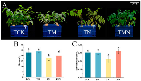 Effects of exogenous MeJA on walnut seedlings under salt stress. (A) Phenotype. (B) Biomass. (C) Leaf relative water content (LRWC). Data: means ±SE (n = 3). Lowercase letters indicate significant differences (p < 0.05, LSD test). TCK: Hoagland’s solution; TM: CK + 50 μM MeJA; TN: CK + 50 mM NaCl; TMN: CK +50 μM MeJA + 50 mM NaCl.