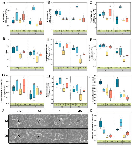 Exogenous MeJA enhances photosynthetic function in salt-stressed walnut seedlings. (A) Chlorophyll a content; (B) Chlorophyll b content; (C) Total chlorophyll content; (D) Fv/Fm; (E) Net photosynthetic rate; (F) Stomatal conductance; (G) Transpiration rate; (H) Intercellular CO2 concentration; (I) Stomatal density; (J) Stomatal morphology (1800×); (K) Stomatal width/length. Data: mean ± SE (n = 3). Lowercase letters indicate significant differences (p < 0.05, LSD) per time point. CK: Hoagland’s solution; M: CK + 50 μM MeJA; N: CK + 50 mM NaCl; MN: CK +50 μM MeJA + 50 mM NaCl.