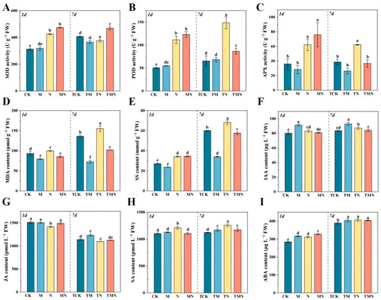 The role of MeJA in hormone regulation was analyzed through IAA, JA, SA, and ABA dynamics. Under N stress at both time points, IAA showed an increasing trend but decreased insignificantly in MN; the highest IAA occurred in M (91.31 μg/L at 1 day) and TM (92.94 μg/L at 7 days) (Figure 3F). JA decreased under N/TN stress but increased insignificantly in MN (1489.25 pmol/L) and TMN (1126.66 pmol/L) (Figure 3G). For SA, N/TN elevated content, but MN and TMN caused significant reductions to 1105.59 pmol/L and 1173.15 pmol/L, respectively; M/TM showed no change versus CK/TCK (Figure 3H). ABA surged significantly in N (311.88 μg/L) at 1 day and further increased in MN (327.57 μg/L), while at 7 days, TM, TN, and TMN showed no significant differences (Figure 3I).