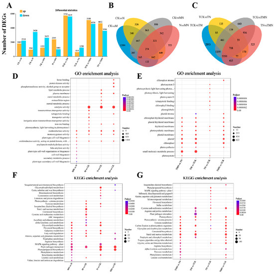 Multi-group comparative transcriptomics reveal MeJA-mediated salt stress responses. (A) DEG counts (up/down-regulated). (B,C) Venn diagrams of DEG overlap. (D,E) Top 10 enriched GO terms. (F,G) Top 10 enriched KEGG pathway. Comparison groups: 1d: MN vs. N, CK vs. M, CK vs. N, CK vs. MN; 7d: TMN vs. TN, TCK vs. TM, TCK vs. TN, TCK vs. TMN. Treatments: CK/TCK: Control; M/TM: 50 μM MeJA; N/TN: 50 mM NaCl; MN/TMN: NaCl + MeJA.