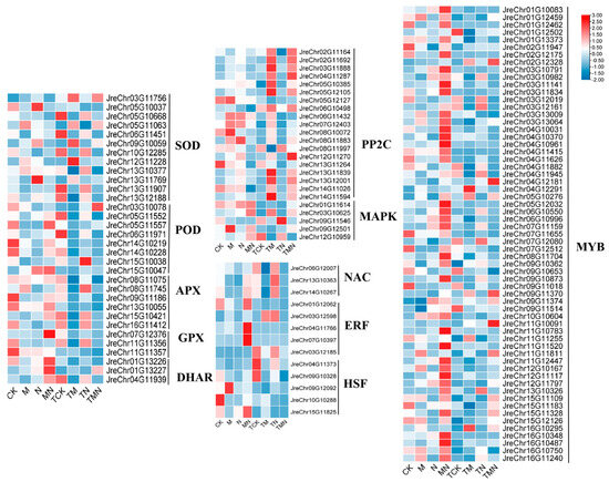 Integrating physiological indicators with transcriptome data, we identified differentially expressed genes (DEGs) regulated by exogenous MeJA. Given the centrality of the antioxidant system in mitigating ROS accumulation, MeJA-induced DEGs were predominantly enriched in antioxidant pathways. Compared to NaCl treatment alone, MeJA supplementation downregulated SOD-related genes but significantly upregulated POD, APX, GPX, and DHAR expression. Concurrently, the MAPK signaling pathway—critical for abiotic stress perception and metabolic reprogramming—exhibited pronounced differential expression: MAPK cascade genes were upregulated, whereas PP2C genes (negative regulators) were downregulated. Furthermore, transcription factors (TFs) contributed substantially to salt stress responses, with exogenous MeJA activating key TF families (ERF, HSF, MYB) under NaCl stress (Figure 5).