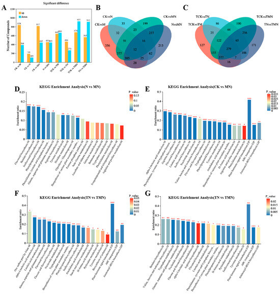 Metabolic reprogramming induced by MeJA under salt stress revealed by KEGG enrichment. (A) DAM counts (up/down-regulated). (B,C) Venn diagrams of DAM overlap. (D–G) Top 20 enriched KEGG pathways. Comparison groups: 1d: MN vs. N, CK vs. M, CK vs. N, CK vs. MN; 7d: TMN vs. TN, TCK vs. TM, TCK vs. TN, TCK vs. TMN. Treatments: CK/TCK: Control; M/TM: 50 μM MeJA; N/TN: 50 mM NaCl; MN/TMN: NaCl + MeJA. Significance levels *, ** and *** represent p < 0.05, p < 0.01 and p < 0.001.