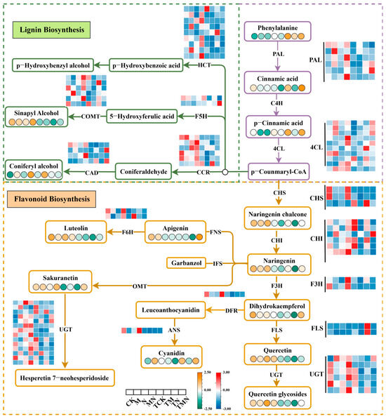Compared to the N treatment, the MN group exhibited significant upregulation of core phenylalanine metabolism genes (PAL, C4H, 4CL), flavonoid biosynthesis enzymes (CHI, F3H, UGT), and lignin synthesis regulators (HCT, COMT, CCR). Concurrently, phenylalanine-derived core metabolites (phenylalanine, cinnamic acid, coumaric acid) and phenylpropanoid-derived hormones were significantly elevated by 7 days post-treatment. Notably, flavonoid precursors (chalcone, naringenin, quercetin) and the lignin metabolite erucitol showed even greater accumulation at 1 day post-treatment (Figure 7).
