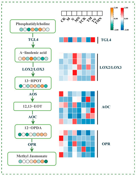 α-Linolenic acid (ALA), a critical polyunsaturated fatty acid, serves as the primary precursor for jasmonic acid (JA) biosynthesis. Under salt stress conditions, exogenous methyl jasmonate (MeJA) application significantly modulated the α-linolenic acid metabolic pathway. Compared to the N treatment, the MN group exhibited marked upregulation of genes encoding key JA synthesis enzymes: TGL4, LOX2/LOX3, AOC, and OPR at 1 day post-treatment. No significant changes were observed at 7 days post-treatment. Additionally, metabolites within the JA synthesis pathway, including phosphatidylcholine (a lipid signaling molecule), α-linolenic acid, 13-(S)-hydroxyoctadecatrienoic acid (13-HOT), and jasmonic acid, were significantly elevated at 1 day post-treatment (Figure 9).