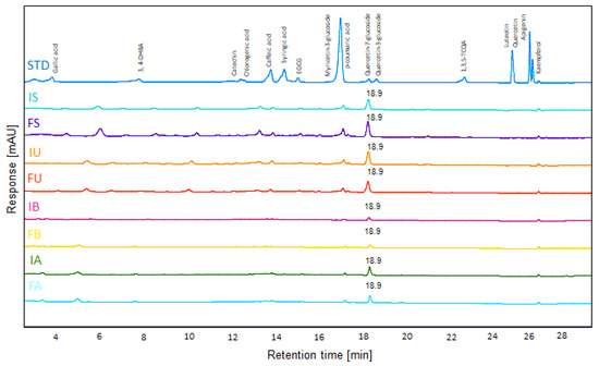 HPLC-UV (280 nm) chromatograms of QF extracts prepared by different extraction methods. Sixteen antioxidants were detected using HPLC/UV 280 nm (STD). Each line shows the standard alongside different 15 mg/mL QF extracts; I: inner shell with Fruit, F: fruit, S: stirring, U: ultrasonication, B: boiled water, A: autoclave.