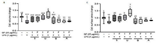 Activation of Raw 264.7 cells by LPS treatment triggers an inflammatory response through the release of cytokines. Activated Raw 264.7 cells exhibit an irregular and rough morphology, with increased spreading and the formation of pseudopodia, which are extensions of the cell membrane used for engulfing particles during phagocytosis, which is accompanied by an increase in cell volume. If the inflammatory response persists excessively after activation, cell death occurs, resulting in decreased cell volume and surface area. To investigate the morphological effects of the extract at a non-cytotoxic concentration (25 µg/mL), which was determined by preliminary results (Supplementary Figure S1A,B), we recorded images before and after LPS treatment, and then examined the changes in cell volume over 24 h in real time (Figure 3A). To quantify the data on cell changes, we utilized the Tomoanalysis software 2.1. Using the negative control as a baseline value of 1, we compared cell volume and surface area changes across groups (Figure 3B,C). Our findings indicate that the cell volume and surface area of those treated solely with LPS significantly decreased after 24 h compared to untreated cells. However, in cells treated with both LPS and the IS, FS, IU FU extracts, there was no significant decrease in cell volume compared to the control cells, suggesting potential inhibition of LPS-induced cell death [37]. However, in water extracts such as IB, FB, IA, and FA, a significant decrease in cell volume was observed compared to the control, suggesting that water extracts have limited potential to prevent LPS-induced cell death. These results are similar to our WST assay. Moreover, we discovered that FU showed a higher cell surface area compared to IU and the negative control. As a result, FU appears to prevent LPS-induced cell death, but shows limitations in suppressing excessive cell activation. In addition, water extracts showed limited effects in preventing LPS-induced cell death.