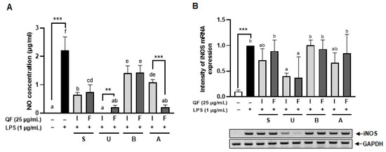 Inhibitory effects of QF extracts on NO concentration and iNOS expression. NO concentration was measured using NO assay (A). iNOS mRNA levels were measured by RT-PCR (B). GAPDH was used for loading the control. Graphic images were processed and analyzed with ImageJ to quantify the data, and the results are presented in graphical form. Results represent as mean ± standard error with indication of statistical significance when the p-value is less than 0.05. Additionally, symbols are used to denote levels of significance: (** p < 0.01; *** p < 0.001; Asterisk (*) denotes independent t-tests performed between values marked with line; over the bar graphs letter means results of ANOVA followed by Duncan’s post hoc test comparing all eight extraction methods, not sharing a letter indicate statistical significance with p < 0.05; I: inner shell + Fruit, F: fruit, S: stirring, U: ultrasonication, B: boiled water, A: autoclave).