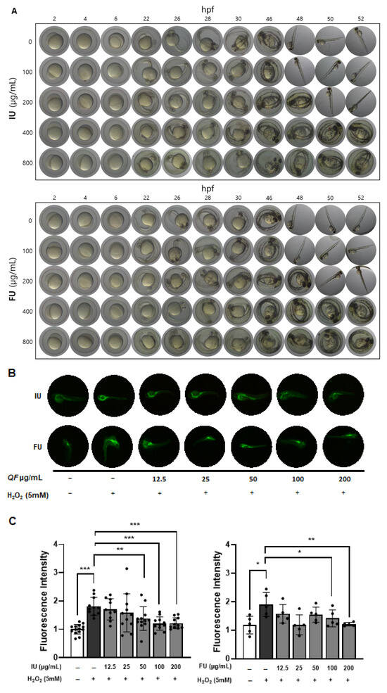 To evaluate the in vivo antioxidant activity of QF extracts, we used zebrafish models treated with ‘U’ extracts prepared from QF containing both fruit and inner shell or the fruit only, as our results above showed that ‘U’ extracts produced the greatest reduction in NO production. Initially, zebrafish embryos were treated with IU and FU extracts at concentrations of 0, 100, 200, 400, and 800 μg/mL as shown in Figure 5A. There were no difference between IU and FU regarding hatching time. In addition, 100 μg/mL QF had the same hatching time (48 h) as the negative control. However, the hatching time was delayed in the presence of both IU and FU extract at 200 μg/mL and above. In addition, no noticeable developmental delays or morphological abnormalities were observed at concentrations ≤ 200 μg/mL. However, at concentrations ≥ 400 μg/mL, most embryos exhibited severe development delays, resulting in postponed hatching. Based on these findings, the maximum concentration for both IU and FU extracts was determined to be 200 μg/mL, which was subsequently used in the following antioxidant experiments.