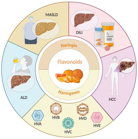Liver diseases have become a significant global health concern, driving increased interest in naturally occurring compounds as adjunctive treatments for managing these conditions. Flavonoids, a class of natural polyphenols found in plants and fruits, offer a broad spectrum of potential health benefits due to their applications in nutraceuticals, pharmaceuticals, and cosmetics. Among them, naringin (NARI) and naringenin (NAR), which are abundant in citrus fruits, have attracted considerable attention. Numerous studies have investigated the therapeutic effects of NARI and NAR across different stages of liver disease. This review highlights recent research on the impact of these flavonoids in alcohol-related liver disease and metabolic dysfunction-associated fatty liver disease (MASLD). It also explores the molecular mechanisms and epigenetic modifications through which NARI and NAR contribute to preventing liver disease progression. Finally, this work discusses recent progresses and future perspectives, emphasizing the role of innovative nanocarriers, nanoparticles, and drug delivery strategies in enhancing the efficacy and bioavailability of these promising compounds to improve liver health.