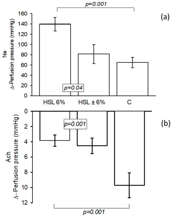 Figure 1a shows the changes in the Δ-PP in the kidney, which increased significantly (p = 0.001) when 20 μM Ne was perfused into the kidney of the rats that consumed the 6% HSL infusion compared to the rats in group C. Eliminating the HSL treatment for one month in the HSL ± 6% rat group showed a significant reduction (p = 0.04). Figure 1b presents the changes in the Δ-PP in the kidney when infusing 20 μM of Ach. The results showed that the group of rats that consumed the 6% HSL infusion had increased vascular resistance in Δ-PP compared to the control group and the HSL group ± 6% (p = 0.001), since there was greater vasodilation in these last groups.