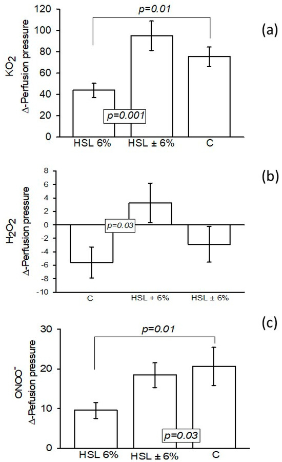When 2 μM KO2 was infused into the kidneys from the rats consuming the 6% HSL infusion, the Δ-PP was significantly decreased compared to the control and HSL ± 6% groups (p = 0.01 and p = 0.001, respectively, as shown in Figure 2a. When 1.7 μM H2O2 was infused into the kidneys from rats consuming the 6% HSL infusion, the Δ-PP was significantly increased compared to group C (p = 0.03) but remained unchanged with respect to group HSL ± 6% (Figure 2b). When ONOO− was infused into the kidneys from the rats consuming the 6% HSL infusion, the Δ-PP was significantly decreased compared to groups C and HSL ± 6% (p = 0.01 and p = 0.03, respectively, as shown in Figure 2c.
