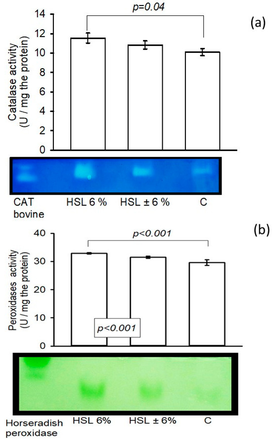 Figure 5a shows the enzymatic activity of CAT in kidney homogenates. There is a significant increase in the group of rats that consumed the 6% HSL infusion (p = 0.04) compared to group C, but without a significant difference compared to the ±6% HSL group. The same figure presents in panel (b) the enzymatic activity of peroxidases in the kidney homogenate in the experimental groups, where there was a significant difference between the group that consumed the 6% HSL infusion compared to the HSL ± 6% groups and group C (p < 0.001).