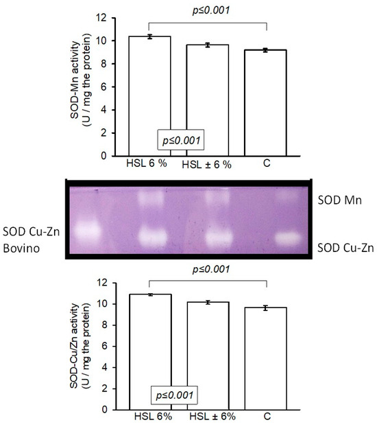 Figure 6 shows that the activity of SOD isoforms (Mn and Cu-Zn, respectively) was significantly increased in the rats that received the HSL 6% infusion (p ≤ 0.001) compared to the rats in the C and HSL ± 6% groups.