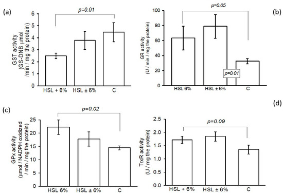 Figure 7 shows the GST activity in panel (a), where a significant decrease was observed between the HSL + 6% group and group C (p = 0.01). However, no significant changes were observed in the HSL ± 6% group. Panel (b) shows differences in the activity of GR in the kidney homogenates between the experimental groups, where a significant increase was observed between the HSL 6% and HSL ± 6% groups (p = 0.05 and p = 0.01, respectively) compared to group C. The GPx activity showed a significant increase (p = 0.02) in the kidney homogenates in the group of rats that consumed the 6% infusion compared to the rats in group C, but no significant changes compared to the HSL ± 6% group C (c). Finally, panel (d) of the same figure shows the enzymatic activity of TrxR in the HSL + 6% group. There were no significant changes with respect to HSL ± 6%, but there was a tendency to decrease without significant changes (p = 0.09) in group C.