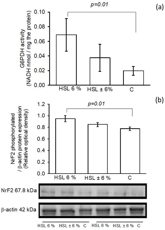 Figure 8a shows the G6PD activity in kidney homogenates in the three experimental groups. The group receiving the 6% HSL infusion showed a significantly increased G6PD activity (p = 0.01) compared to group C, but the activity remained unchanged when compared to the ± 6% HSL group. In the same figure, in panel (b), the phosphorylated expression of Nrf2 in the kidney homogenate in the three groups of rats is shown, where the group of rats that consumed the 6% HSL infusion showed a significant increase (p = 0.01) compared to group C, but without significant changes with respect to the HSL ± 6% group.