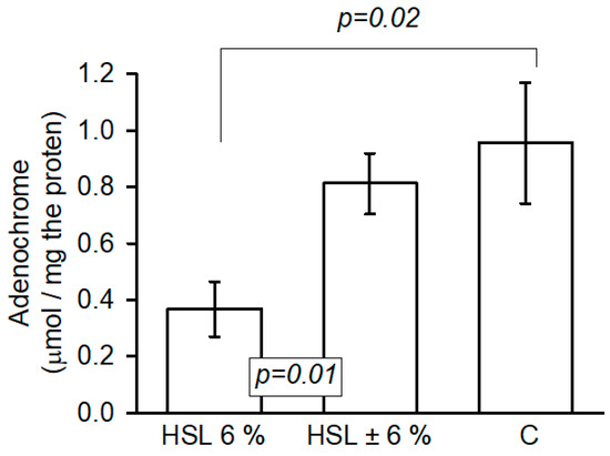 Figure 9 shows the oxidation of epinephrine to adenochrome by the action of the O2− anion, which is an accepted method for measuring the generation of this radical. The results showed a significant decrease (p = 0.02 and p = 0.01, respectively) in the kidney homogenate of the rats in the group that consumed the 6% HSL infusion compared to groups C and HSL ± 6%.