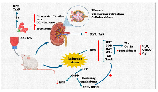 On the other hand, HSL is a functional food because it provides various components with biological activity; for example, it provides antioxidant molecules, minerals, and essential amino acids. In the pathological conditions that have a highly oxidative background, such as metabolic syndrome and Marfan syndrome, 1.5–2% HSL infusions reduce OS, which is reflected in an improvement in redox homeostasis [34,43]. However, these beneficial characteristics could become harmful if HSL is consumed for a prolonged period of time and in excess. Its excessive consumption may promote an increase in the antioxidant enzymes and reducing equivalents, which could lead to RS and, consequently, to an imbalance in redox homeostasis that may lead to alterations in different organs, such as the kidneys. The balance between prooxidants and antioxidant molecules is essential for proper renal function [44].