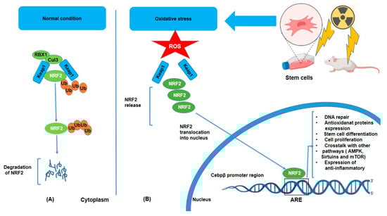 However, the level of ROS induced by IR is a crucial factor in activating various signaling pathways to promote cell survival and cell differentiation and regulate antioxidant responses [11]. NRF2 activation depends on some critical factors, including dose (the amount of energy deposited by IR per unit mass of biological tissue, expressed in grays (Gy)) and dose rate (the rate at which radiation dose is delivered to a biological system, typically over time, typically expressed in Gy/min), cell type, level of antioxidants in the cell and environmental factors, and may occur after a delay, suggesting it acts as a second-tier antioxidant response system [19,20]. Hence, in this updated and critical review, we have been focused on NRF2 signaling after IR and its role in the differentiation and proliferation of various stem cells. Furthermore, the authors recommended some suggestions for future perspective.