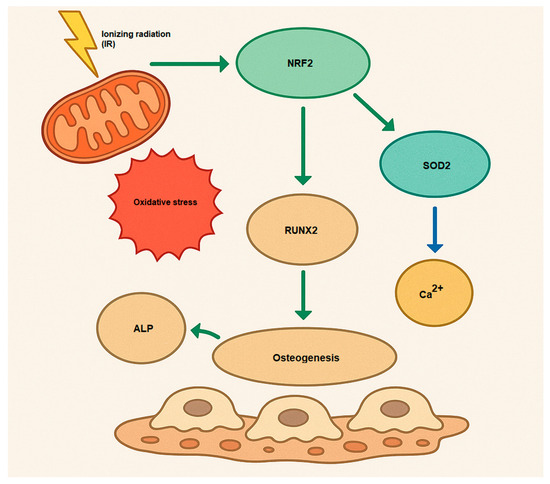Osteogenesis mechanism via activation of NRF2 by IR (oxidative stress). Runx2, Runt-related transcription factor 2; ALP, alkaline phosphatase; Ca2+, Calcium; SOD2, superoxide dismutase 2, mitochondrial.