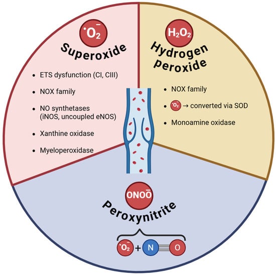 The main ROS along with their sources investigated in CVD are depicted in Figure 1.