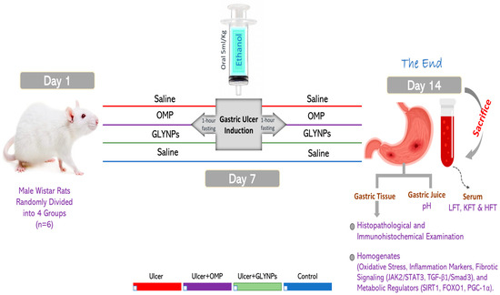 Twenty-four healthy male Wistar rats, with weights ranging from 200 to 250 gm, were employed. GUs were induced with a single oral dose of absolute ethanol (5 mL/kg) through intragastric gavage [36]. The experimental subjects were randomly allocated to four groups (n = 6). The control group consisted of untreated, normal rats. The ulcer group (UL): rats were administered a single dose of absolute ethanol on day 7 and remained untreated until the end of the experiment on day 14. The Ulcer + OMP group: rats received oral OMP (20 mg/kg) for 7 days [37,38]. On day 7, one hour after OMP therapy, the rats were administered a single dose of absolute ethanol, followed by daily OMP delivery until day 14. The ulcer + GLY-NPs group: rats were administered oral GLY-NPs (10 mg/kg) [39] for 7 days, followed by a dose of absolute ethanol on day 7, one hour post-GLY-NP administration, with GLY-NP treatment persisting until day 14 (Figure 1).